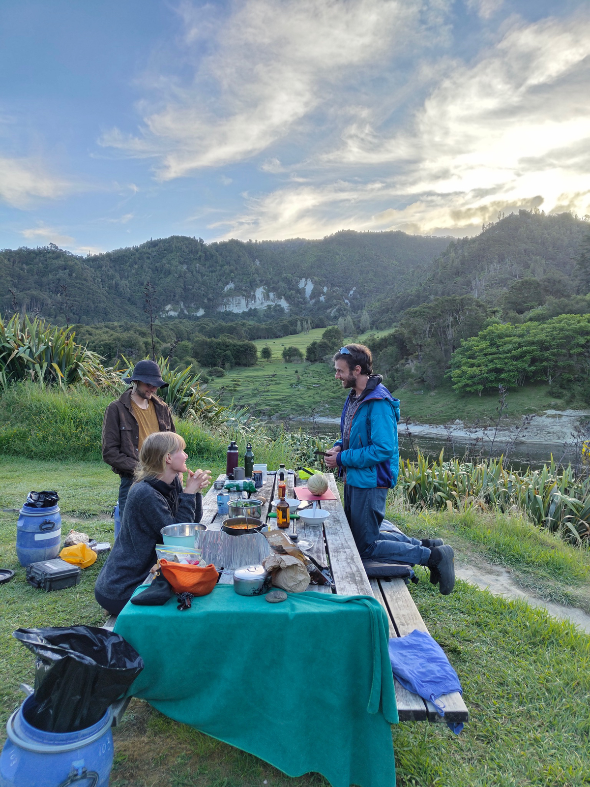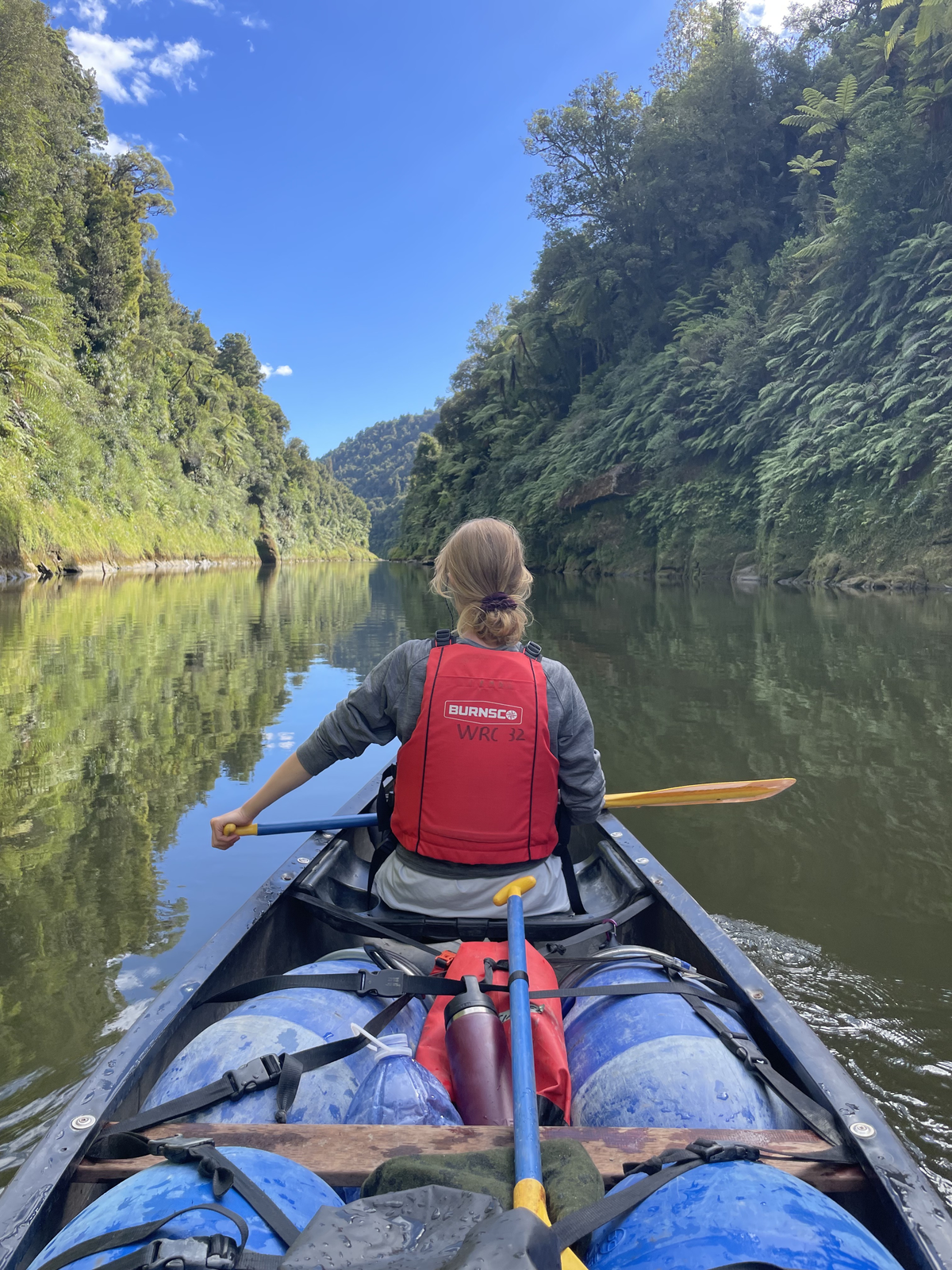 Danach bereiteten wir uns auf unser nächstes Erlebnis vor – anstelle eines „Great Walks” planten wir den „Great Paddle”- eine 4-tägige Kanutour auf dem Whanganui River. 4 Tage mitten in Neuseelands Wildnis, ohne Empfang, ohne Guide und ohne viel Paddelerfahrung. Die beliebten Touren werden von vielen Anbietern durchgeführt. Wir entschieden uns für einen kleinen Familienbetrieb und fuhren zu dem dazugehörigen Campingplatz. Dort folgte ein Sicherheitsbriefing, wir wurden eingekleidet und bekamen große Fässer für Kleidung und Essen. Der Vorteil an einer Kanutour ist, dass man nicht auf das Packgewicht achten muss. Tatsächlich wurde die Vorbereitung dadurch noch schwieriger. Beim Wandern packen wir nur das Nötigste ein, jetzt fanden Wassermelone und Feierabendbier ebenfalls ihren Weg in die Fässer. Mit zwei anderen Pärchen, die wir im Laufe unserer Tour abends auf den Campingplätzen wiedertrafen, wurden wir zum Startpunkt der Paddeltour gebracht und bekamen ein paar letzte Hinweise von unserem Guide gesagt, der danach am Ufer zurückblieb. Da es seit langer Zeit nicht mehr geregnet hatte, war der Wasserspiegel niedrig, was mehr Paddeln bedeutete. In 4 Tagen paddelten wir über 100 Kilometer und wurden von Paddelanfängern zu naja, Fortgeschrittenen. Die größten Herausforderungen waren die vielen Stromschnellen, durch die man zwar schneller vorankam, allerdings waren die nicht ganz ungefährlich. Wenn man nicht genau die Mitte der Stromschnelle anpaddelte (das sogenannte „V“), wurde man dahinter gerne mal im Kreis gedreht oder, was Matthias und mir passiert ist, man kenterte fast! Es war der letzte Tag, und wir wurden vor der Stromschnelle, genannt „50/50”, vorgewarnt. Nur 50 % schaffen es heil durch diese Etappe. Wenn einem das zu riskant war, konnte man das Kanu am Ufer vorbeitragen. Wir ließen uns darauf ein (no risk, no fun) und paddelten, so stark wir konnten, genau darauf zu. Mit einem ganz leichten Winkel wichen wir von der Mitte ab, bei dieser Stromschnelle ein Problem. Sofort schwappte literweise Wasser ins Kanu, und in meiner Panik fing ich an, das Wasser mit den Händen rauszuschöpfen, statt weiter zu paddeln. Andere Paddler, die sich das Spektakel am Ufer anschauten und schon durch die Stromschnellen durchgekommen waren, riefen uns laut zu und signalisierten mit Händen und Füßen, dass ich weiterpaddeln musste. Erst da kam ich wieder zu Sinnen und in letzter Sekunde schafften Matthias und ich es ans Ufer, wo wir das Kanu mit Hilfe anderer auskippten. Tobi und Selma kamen deutlich entspannter an, die Stromschnelle erhielt ihren Namen wirklich zurecht. Eine etwas unspektakuläre Stromschnelle konnten wir auf Video festhalten: